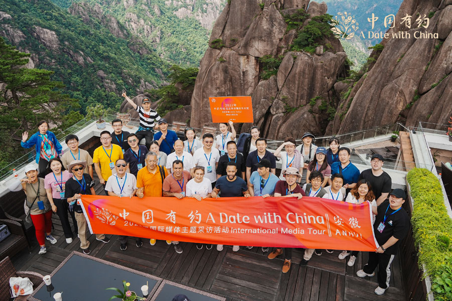 Members of "A date with China" international media tour take group photos during a visit to Huangshan Mountain in East China's Anhui province, July 1, 2022. [Photo/chinadaily.com.cn]