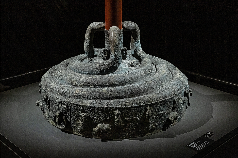 Consisting of three coiled snakes, the base is adorned with intricate relief depicting figures, snakes, oxen, sheep, monkeys and mythical birds. As the largest and heaviest bronze drum base ever discovered in China, it seems to resonate with the rhythm of ancient drumbeats, sending its blessings for Spring Festival!