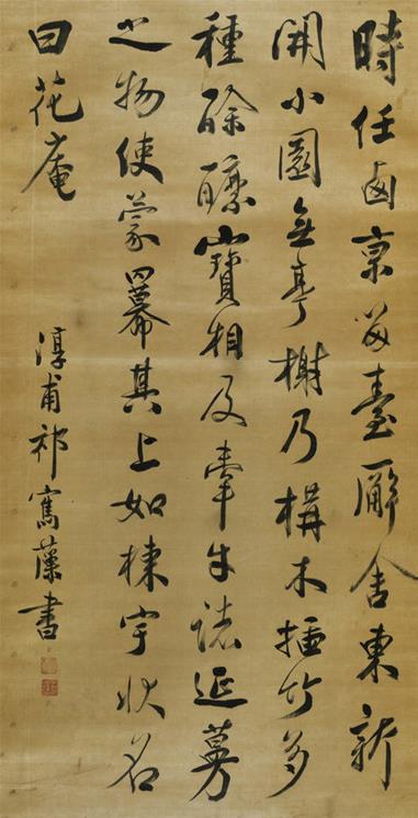 This is a calligraphy piece on silk damask, written in running script by Qing Dynasty (1644-1911) calligrapher Qi Junzao (1793-1866). The brushwork is rounded and full, expansive horizontally and vertically. The text mainly describes how the artist, while serving in the western capital, created a small garden on the east side of his office. He built a simple framework of wood and bamboo and planted climbing flowers and vines to cover it like a building, naming it the "Flower Hermitage". Collection: Shanxi Museum.