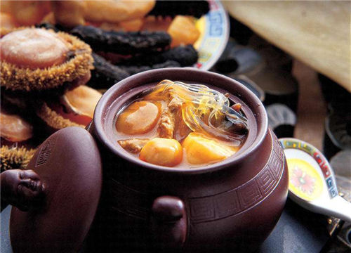 Buddha Jumps over the Wall is one of the most typical cuisines in Fujian. It is made of 18 pricey ingredients, including shark's fin, abalone, sea cucumber, ginseng and scallops. All these are simmered together for long hours over slow fire, ensuring the essence has been extracted.