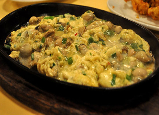 The oyster omelet is widely known for its savory taste. The dish consists of an omelette with a filling commonly made of small oysters, eggs and scallions, and a sauce poured on top of the omelet for added taste.